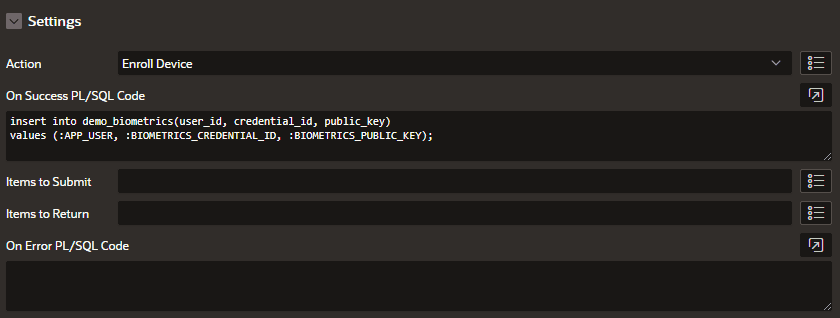 BEGIN -- Retrieve stored credential for verification select public_key, user_id into :BIOMETRICS_PUBLIC_KEY, :BIOMETRICS_USER_ID from biometrics_credentials where credential_id = :BIOMETRICS_CREDENTIAL_ID; END;Success Handler (Optional):
