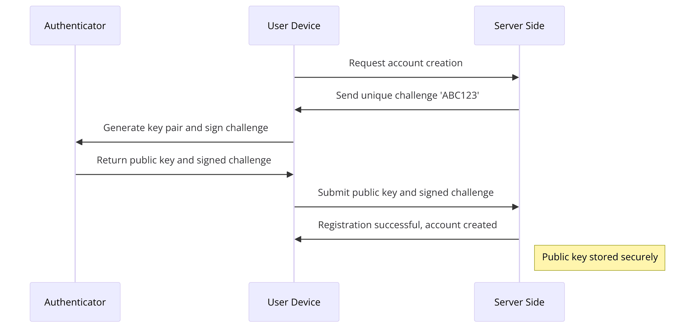 The application must create a challenge and configure the publicKey options for navigator.credentials.create(). Once a user registers, the public key and credential ID are stored in a secure table.